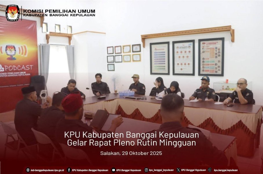 Salakan – KPU Kabupaten Banggai Kepulauan gelar rapat pleno rutin mingguan bertempat di ruang media center KPU Kabupaten Banggai Kepulauan, Rabu (29/10/2025). Kegiatan dibuka langsung oleh ketua KPU kabupaten Banggai kepulauan, Supriatmo Lumuan dan dihadiri anggota KPU kabupaten Banggai kepulauan, Ayub M. Tiah, Jamaludin Pobalos, Fatharany Berkah Abdul Barry dan Louis Steven, Sekretaris, Nurul Huda dan seluruh kepala subbagian serta notulensi. Adapun agenda rapat berkaitan dengan tindaklanjut Surat Dinas KPU RI Nomor 1766/PW.02-SD/11/2024 tanggal 17 Oktober 2025 perihal langkah-langkah strategis dalam rangka percepatan pelaksanaan pembangunan zona integritas pada satuan kerja dilingkungan KPU Provinsi/KIP Aceh dan KPU/KIP Kabupaten/Kota. KPU Kabupaten Banggai Kepulauan selanjutnya akan menindaklanjuti melalui rapat internal bulanan dengan tema Penguatan Kelembagaan dan Sosialisasi Pembangunan Zona Integritas yang akan dilaksanakan pada hari/tanggal, Jum'at, 31 Oktober 2025 bersama seluruh ASN Sekretariat KPU kabupaten Banggai kepulauan. Disamping itu pleno rutin juga membahas berkaitan program kegiatan masing-masing divisi dan subbagian yang telah dilaksanakan, sementara berjalan dan yang akan dilaksanakan. ....