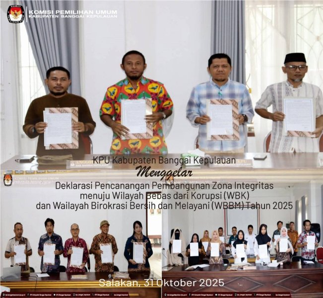 Salakan – Jajaran KPU Kabupaten Banggai Kepulauan melakukan Deklarasi Pencanangan Pembangunan Zona Integritas sebagai upaya mewujudkan pemerintahan yang bersih, akuntabel, serta pelayanan publik yang prima. Kegiatan ini sebagai langkah awal bentuk komitmen pimpinan dan jajaran KPU Kabupaten Banggai Kepulauan untuk mewujudkan wilayah bebas dari korupsi (WBK) dan wilayah birokrasi bersih dan melayani (WBBM) melalui reformasi birokrasi khususnya dalam hal pencegahan korupsi dan peningkatan kualitas pelayanan, hal ini disampaikan Ketua KPU Kabupaten Banggai Kepulauan, Supriatmo Lumuan saat membuka kegiatan Rapat Penguatan Kelembagaan dan Sosialisasi Pembangunan Zona Integritas Tahun 2025 bersama seluruh jajaran KPU Kabupaten Banggai Kepulauan pada Jum'at (29/10/2025). Disamping itu, Supriatmo menyampaikan melalui kegiatan ini dapat menjadi sarana menyampaikan aspirasi dan memberikan saran yang membangun untuk performa lembaga kita dan Pimpinan serta seluruh ASN juga telah melakukan penandatanganan Pakta Integritas/Piagam bersama Pembangunan Zona Integritas dan Maklumat Pelayanan. Dari komitmen tersebut diharapkan dapat membangun persepsi masyarakat yang positif terhadap Satker KPU Kabupaten Banggai Kepulauan dan menunjukkan kepada publik bahwa KPU tidak hanya berkewajiban menyukseskan Pemilu dan Pilkada saja, tetapi juga berkewajiban memiliki akhlak dan moral yang baik dalam berperilaku. Setelah dilaksanakannya penandatanganan pakta integritas ini, seluruh perilaku, pikiran, ucapan dan apa yang akan kita laksanakan dituntut untuk sesuai dengan apa yang telah kita tandatangani. Kegiatan ini merupakan suatu langkah konstruktif (membangun) untuk memperbaiki kekurangan yang ada pada satker kita dan juga sebagai langkah awal untuk membangun pondasi yang kuat bagi Lembaga kita, ujarnya. Ditengah tahapan Pemilu dan Pilkada 2024 yang baru selesai, KPU Kabupaten Banggai Kepulauan tidak mungkin dapat melaksanakan Pembangunan Zona Integriatas karena padatnya kegiatan krusial tahapan Pemilu dan Pilkada sehingga Satker KPU Kabupaten Banggai Kepulauan baru dapat melaksanakan Pembangunan Zona Integritas pada tahun 2025 ini, ujarnya. KPU Kabupaten Banggai Kepulauan akan fokus melakukan aktifitas yang berkaitan dengan Zona Integritas khususnya yang menitikberatkan pada 6 (enam) area perubahan yakni Manajemen Perubahan, Penataan Tatalaksana, Penataan Manajemen SDM, Penguatan Akuntabilitas Kinerja, Penguatan Pengawasan, dan Peningkatan Kualitas Pelayanan Publik, tutupnya. Disamping itu Ketua KPU Kabupaten Banggai Kepulauan juga menandatangani Maklumat Pelayanan Informasi sebagai bentuk jaminan kualitas pelayanan prima kepada publik. Sebagai tindaklanjut Surat Dinas KPU RI Nomor 1766/PW.02-SD/11/2025 perihal langkah-langkah strategis dalam rangka percepatan pelaksanaan pembangunan zona integritas pada satuan kerja dilingkungan KPU, KPU Provinsi dan KPU Kab/Kota, KPU RI sedang mempersiapkan satuan kerja yang akan diusulkan Zona Integritas menuju WBK/WBBM Tahun 2026. Turut hadir Ketua dan seluruh anggota KPU kabupaten Banggai Kepulauan, Sekretaris KPU Kabupaten Banggai Kepulauan, Pejabat Struktural Eselon IV dan seluruh ASN dilingkungan Sekretariat KPU Kabupaten Banggai Kepulauan. ....