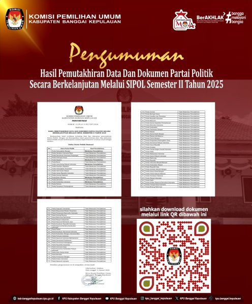 Salakan –Menindaklanjuti Surat Dinas Ketua Komisi Pemilihan Umum tanggal 11 Desember 2025 perihal Pemutakhiran Data Partai Politik secara Berkelanjutan melalui Sipol Semester II Tahun 2025. KPU Kabupaten Banggai Kepulauan menyelenggarakan kegiatan sosialisasi pemutakhiran data partai politik secara berkelanjutan melalui Sistem Informasi Partai Politik (Sipol) pada Kamis, 18 Desember 2025 yang dihadiri oleh Ketua Bawaslu Kabupaten Banggai Kepulauan dan perwakilan dari partai politik peserta Pemilu 2024 tingkat Kabupaten Banggai Kepulauan. Selanjutnya, pada Selasa, 30 Desember 2025 KPU Kabupaten Banggai Kepulauan melaksanakan verifikasi administrasi pemutakhiran data partai politik berkelanjutan untuk Semester II Tahun 2025, sebagaimana diatur dalam Peraturan KPU Nomor 4 Tahun 2022 dan Keputusan KPU Nomor 658 Tahun 2024. Proses ini di antaranya pemeriksaan kesesuaian data kepengurusan, keterwakilan perempuan minimal 30%, keanggotaan, serta domisili kantor tetap partai politik melalui Sistem Informasi Partai Politik (Sipol). Dalam pelaksanaannya, Bawaslu Kabupaten Banggai Kepulauan melakukan pemantauan guna memastikan tahapan berjalan transparan, akuntabel, dan sesuai prosedur. Berdasarkan hasil verifikasi pemutakhiran data dan dokumen partai politik secara berkelanjutan melalui Sipol terdapat 5 (lima) partai politik ditingkat Kabupaten Banggai Kepulauan yang melakukan pemutakhiran yakni PKB, NasDem, Gelora, PBB dan PSI. Berikut disampaikan Hasil Pemutakhiran Data dan Dokumen Partai Politik secara Berkelanjutan melalui SIPOL Semester II Tahun 2025. >>>>lihat dan download Pengumuman disini<<<< ....