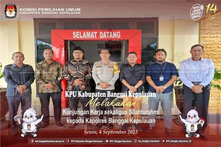 KPU BANGKEP, Salakan, Ketua KPU Kab. Banggai Kepulauan, Supriatmo Lumuan dan Anggota KPU Kab. BanggaiKep, Fatharany Berkah Abdul Barry, melakukan KUKER (Kunjungan Kerja), sekaligus silaturahmi kepada Kapolres Kabupaten Banggai Kepulauan, Jl Bhayangkara, Kec. Tinangkung, Senin (04/09/2023). Hari ini KPU dan teman2 bawaslu bersilaturahmi dan berdiskusi bersama pak Kapolres Banggai Kepulauan. Pada kesempatan ini Bapak Kapolres Kab. Banggai Kepulauan AKBP Jimmy Marthin Simanjuntak, S.I.K didampingi Kasat Intelkam AKP Dwi Harjaka menerima kunjungan dari KPU Kab. Banggaikep dan Bawaslu Kab. Banggai kep. Ketua Kpu Bangkep, Supriatmo Lumuan Mengungkapkan, Banyak hal yang perlu didiskusikan secara santai mulai soal tahapan pemilu dan tentu juga soal rilis bawaslu tentang Banggai Kepulauan yang Masuk 3 besar Kerawanan politik uang di Indonesia. ” Banyak Hal yang didiskusi secara santai soal mulai tahapan pemilu dan tentu juga soal rilis Bawaslu tentang Banggai Kepulauan yang masuk 3 Besar Kerawanan politik uang di Indonesia.” ungkapnya. (**) Hadir pula Ketua Bawaslu Kab. Banggai kep, Muslim Abd. Muin dan Anggota Bawaslu Kab. Banggai kep, Jainuddin Laruhami beserta koordinator Sekretariat Bawaslu Kab. Banggaikep, Suparman Ahaba. Penulis : RUSDIANTO-HUMAS KPU BANGKEP