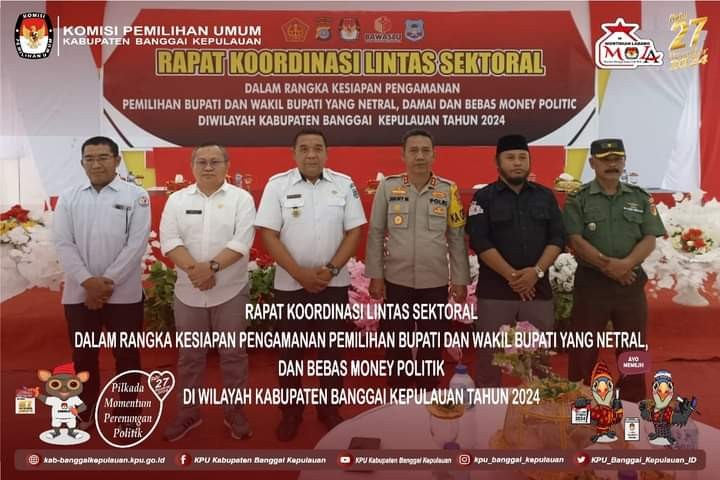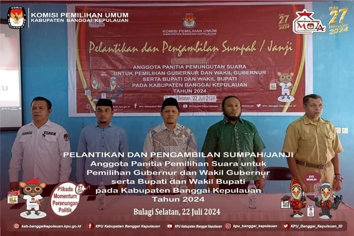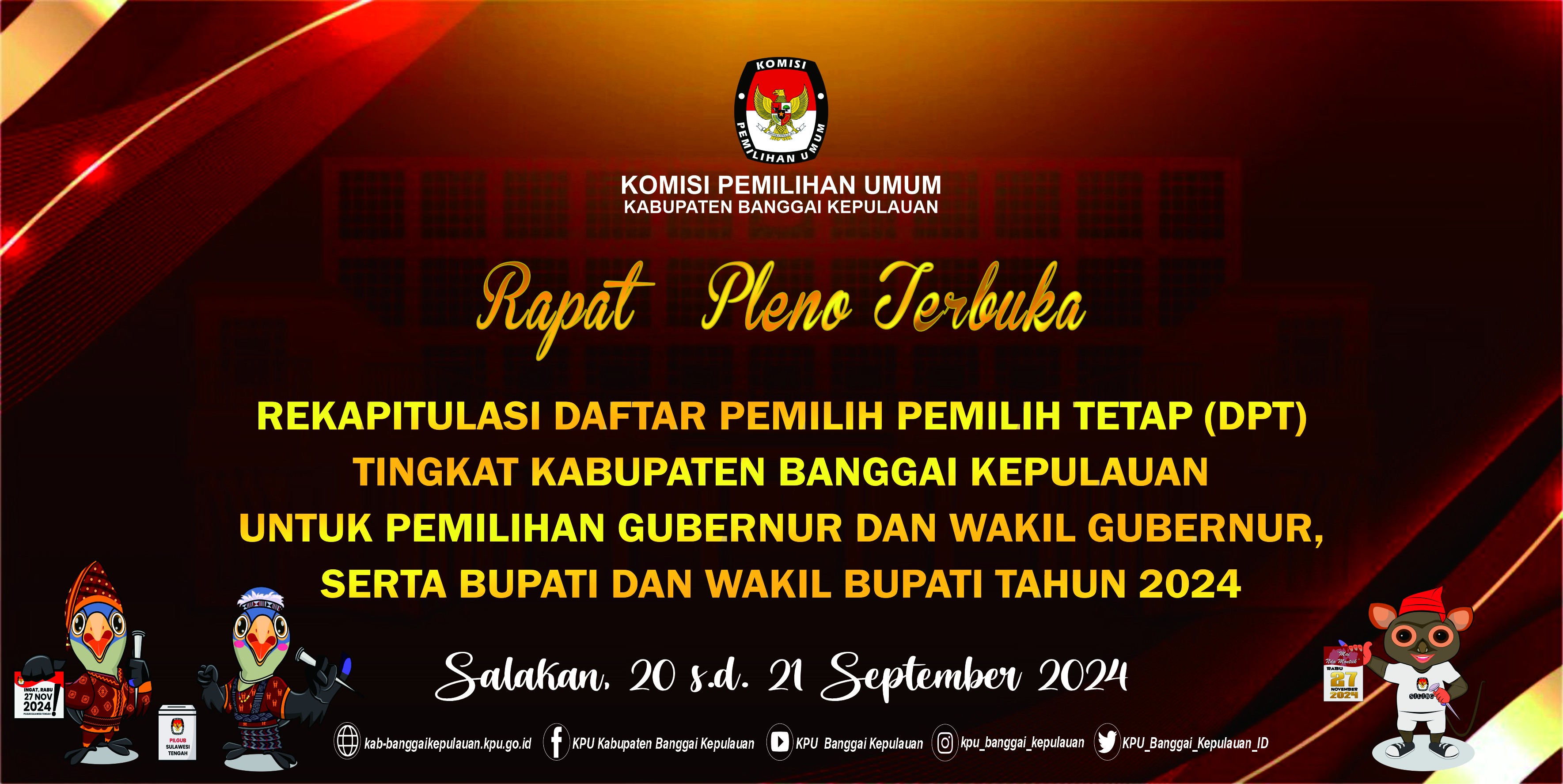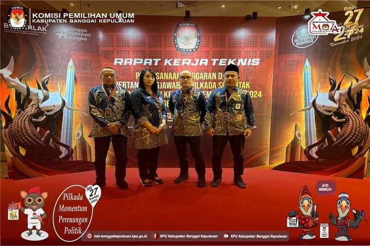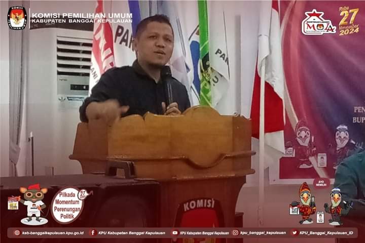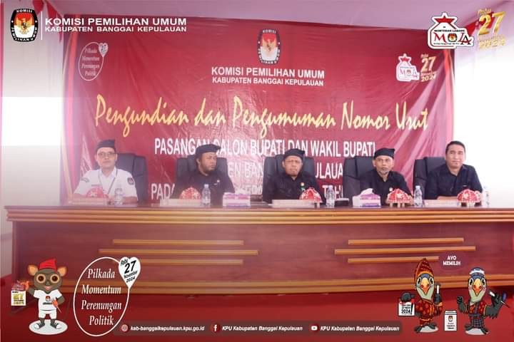 KPU BANG- KEP,- SALAKAN, Ketua KPU Kabupaten Banggai Kepulauan, Supriatmo Lumuan, anggota KPU Banggai Kepulauan, Louis Steven, Fatharany Berkah Abdul Barry, Ayub M. Tiah dan didampingi Sekretaris KPU Banggai Kepulauan Nurul Huda, gelar rapat pleno terbuka pengundian dan penetapan nomor urut pasangan calon bupati dan wakil bupati kabupaten Banggai Kepulauan pada Pemilihan Kepala Daerah Serentak tahun 2024 bertempat dihalaman kantor KPU Kabupaten Banggai Kepulauan, Senin (23/09/2024). Adapun hasil pengundian dan penetapan nomor urut pasangan calon bupati dan wakil bupati kabupaten Banggai Kepulauan tahun 2024 sebagai berikut: Nomor Urut 1 : Pasangan calon Rusli Moidady, S.T.,M.T dan Serfi Kambey. Nomor Urut 2 : Pasangan calon Yutdam Mudin, S.Si.,M.Si dan Tamin, S.Pd.,M.Si. Nomor Urut 3 : Pasangan calon Fatiyah Suryani Mile, S.H.,M.H dan Sudirman Sapat, S.Pd.,M.Si. Nomor Urut 4 : Pasangan calon Ir. Sugianto, S.T dan Hery Ludong, S.T.