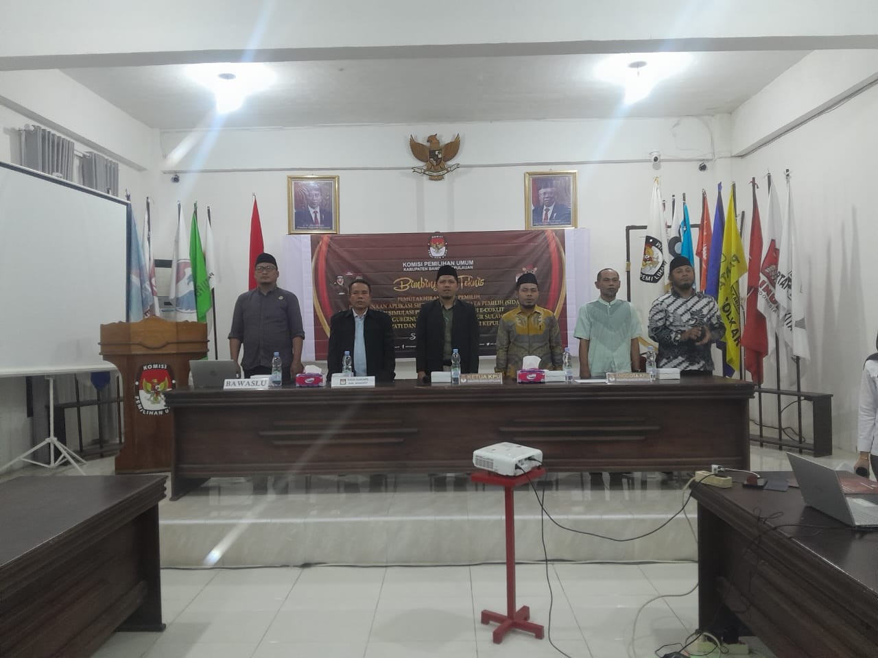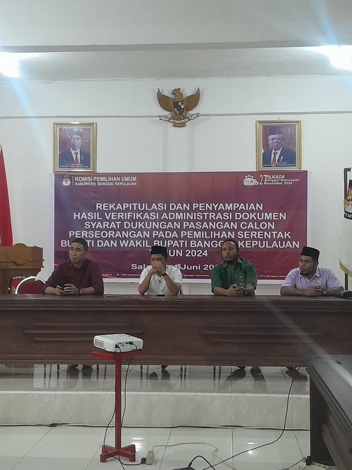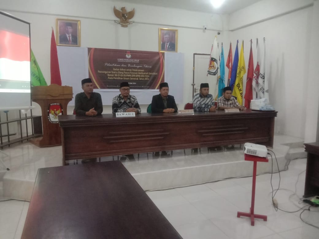 KPU BANGKEP,- Salakan, KPU Banggai Kepulauan Menggelar Pelantikan BIMTEK Badan adhoc untuk melaksanakan PSU Pasca putusan MK, melalui putusan nomor 98-01-05-26/PHPU.DPR-DPRD-XXII/2024, Pada pemilihan Umum serentak Tahun 2024. Bertempat di Aula KPU Kab. Bangkep. Kamis (20/6/2024). Makamah Konstitusi (MK) memerintahkan KPU Kabupaten Banggai Kepulauan untuk melakukan PSU untuk pemilihan DPRD Kabupaten Banggai Kepulauan. PSU tersebut berada di Dapil Bangkep 2, TPS 1 Desa Tatakalai, Kecamatan Tinangkung Utara, Bangkep. Ketua KPU Banggai Kepulauan Supriatmo Lumuan, berharap agar seluruh Kepada PPK, PPS, KPPS, pasca Putusan MK, yang baru saja dilantik dan di ambil sumpah,dapat mengerjakan proses PSU ini dengan sebaik-baiknya. "Saya harap kepada rekan-rekan sekalian ini adalah tugas tambahan bagi kita, apalagi Beririsan dengan tahapan Pilkada, dan kita harus ambil hikmannya, mudah- mudahan apa yang kita laksanakan menjadi amal ibadah Buat Kita, untuk itu mengerjakan PSU ini dengan penuh tanggung jawab agar proses pemungutan suara ulang ini dapat berjalan dengan baik dan lancar,"ujar Supriatmo. Kegiatan tersebut dihadiri oleh pimpinan Komisioner KPU, Pa Jamaludin Pobalos selaku Pemangku Devisi Rendatin, Pa Fatharany Berkah Abdul Barry, selaku pemangku Devisi Sosdiklih, Parmas Dan SDM, Ketua Bawaslu Kab. Bangkep Muslim Abd. Muin Bakara, dan Anggota Bawaslu, Staf sekretariat, KPU..Rohaniawan Islam, Rohaniawan Kristen, Dan peserta Yang Dilantik.